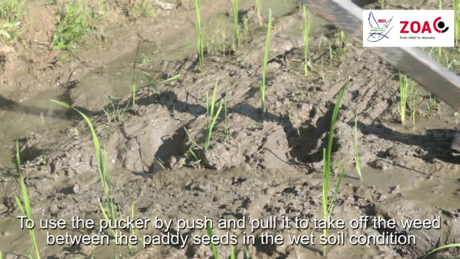 In a number of aspects, the new planting method is different than the way the farmers used to work. ZOA-MDS wanted to increase the rice production by growing seedlings on trays before they are planted which means a faster start. The preparation of the field is another important for the success of the system. The field is leveled and made free of weeds before the organic fertilizer is added. After the field is prepared the drainage system is made in order. More on the preparation in this MDS-vlog: