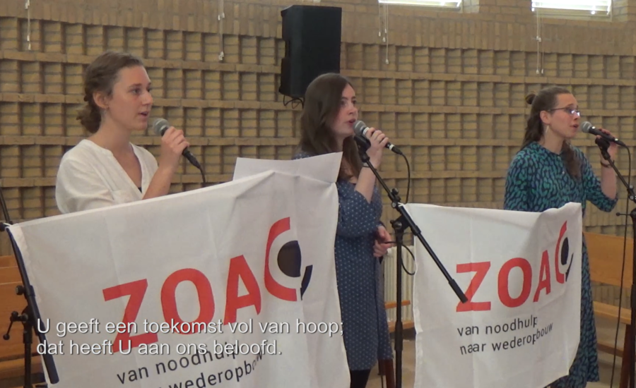 “Net als vorig jaar kon de huis-aan-huis collecte niet doorgaan. We weten dat dit een enorme inkomstenbron is voor ZOA. Omdat wij eigenlijk alleen de collecte en de kruidnotenactie jaarlijks organiseren, wilden we vorig jaar al iets anders erbij doen. Dat werd een live concert – dat kon vorig jaar met het oog op corona nog net. Er zijn een paar werkgroepsleden met bovengemiddeld muzikale kinderen, dus een concert was snel georganiseerd. We zochten sponsors en haalden een mooi bedrag op. Dit jaar was een live concert niet mogelijk, dus ontstond het idee voor een online ZOA Houd Moed concert. Eind mei hebben we het concert opgenomen in de Rehobothkerk in Krimpen aan den IJssel, en op 3 juli is het in première gegaan.”